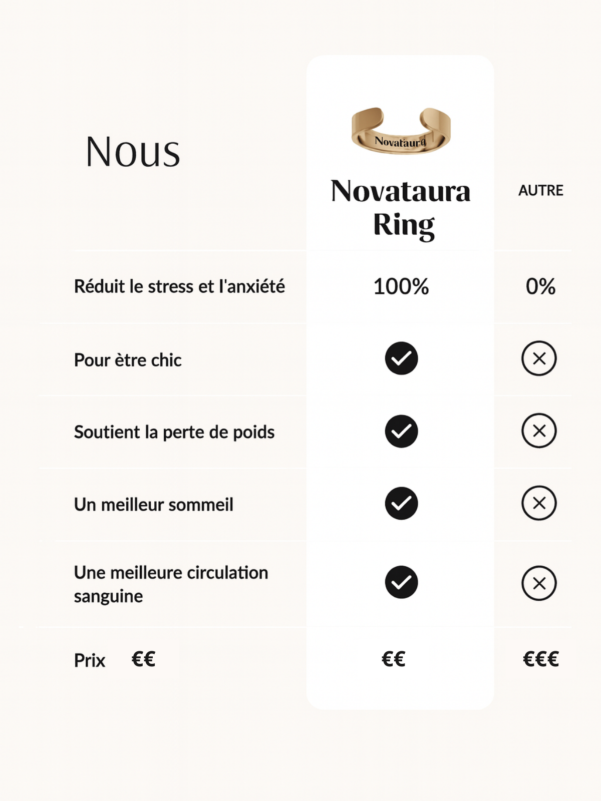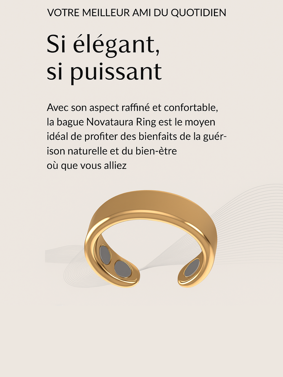 « Ce que j’adore, c’est que la bague Novataura agit sans effort. Je la porte toute la journée et je me sens plus concentrée, plus sereine, sans avoir à y penser. Simple, efficace et très confortable. »