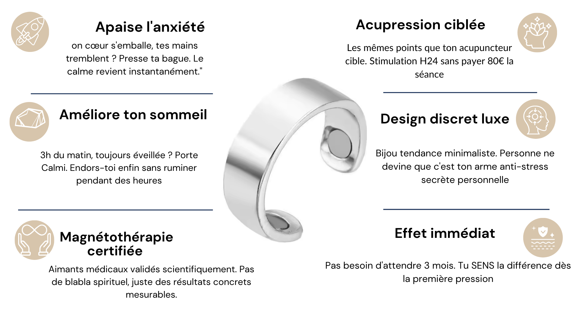 « J’ai surtout remarqué une vraie différence sur mon stress quotidien. Je me sens plus calme et moins submergée, même pendant les journées chargées au travail. En plus, la bague est élégante et passe avec toutes mes tenues. »